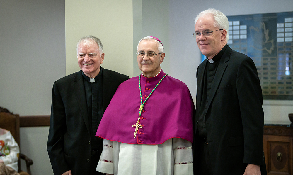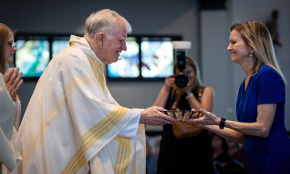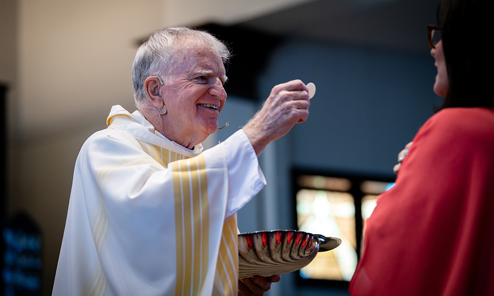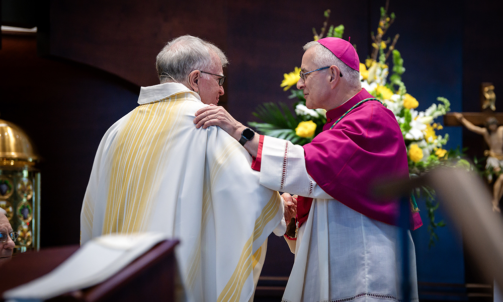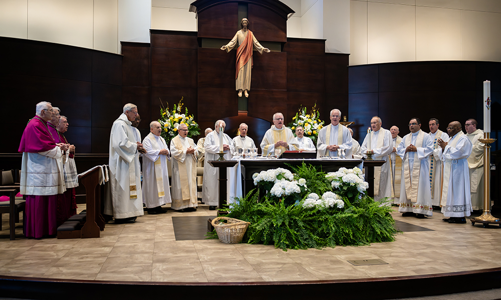 On April 12, Prince of Peace Catholic Church in Hoover was at full capacity as parishioners and friends and family of Father Ray Dunmyer flocked to the parish to celebrate the priest’s 50th anniversary of ordination to the priesthood. Archbishop Joseph Marino, Bishop Steven Raica, and Bishop Emeritus Robert Baker were in choir and more than 14 priests concelebrated, including Abbot Marcus Voss, O.S.B. Deacons Rick DiGiorgio, Gary Hoover, and Wally Zieverink assisted. Following Mass, a luncheon in Father Dunmyer’s honor was held in the parish’s Deasy Hall. Father Dunmyer was ordained to the priesthood on April 3, 1976, by Bishop Joseph Gregory Vath, the diocese’s first bishop, at the Cathedral of St. Paul in Birmingham. Over the course of his 50 years as a priest, Father Dunmyer has served many parishes throughout the diocese, offering particular service in spiritual formation, campus ministry, ecumenical activities, and interfaith initiatives.