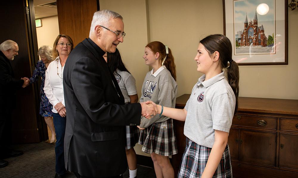 This year, Bishop Steven Raica decided to use the local, winning artwork for his 2023 Christmas card collection. Students received certificates and were invited to a meet and greet with the bishop and Father Ray Remke, diocesan MCA director. This year’s winners were Olga Kern, St. Francis Xavier Catholic School first grader; Hannah Caesar, Our Lady of the Valley Catholic School fifth grader; Yamilet Gonzalez, Our Lady of the Valley Catholic School seventh grader; Elizabeth O’Farrell, Our Lady of the Valley Catholic School eighth grader; and Mary Lynn Owens, St. John Paul II Catholic High School sophomore.