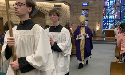 My dear brothers and sisters in Christ, today, on the eve of the great feast of Pentecost, the Church in the Diocese of Birmingham rejoices with the people of God gathered here at St. Francis of Assisi University Parish. It was here that the seeds of vocation were sown in the heart of Andrew Vickery, and at University of Alabama in Huntsville, John Paul Stepnowski opened his heart to hear God’s call more clearly. A very warm welcome to Bishop Baker, our emeritus bishop, along with my brother priests, deacons, consecrated women and men, families, seminary representatives from the Pontifical College Josephinum, and friends of Andrew and John Paul. It is here, in these various communities of prayer, of worship, and of service, that they first heard the gentle but persistent call of the Lord: “Come, follow Me.” Today, before your eyes, they are to be ordained as deacons of and for the Church — not for their own glory or comfort, but to serve the Gospel of Christ with their whole lives.