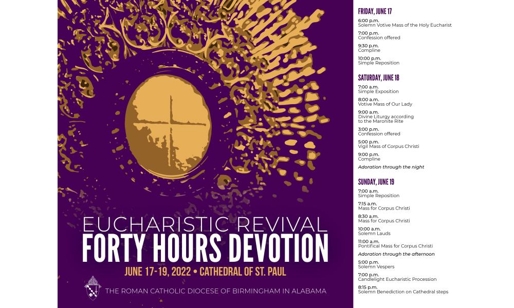 The United State Conference of Catholic Bishops (USCCB) has called for a Eucharistic Revival, a three-year “grassroots revival of devotion and belief in the Real Presence of Jesus in the Eucharist.” The mission of the revival is to renew the Church by enkindling a living relationship with the Lord Jesus Christ in the Holy Eucharist. Locally, we will prepare for the Eucharistic Revival with a Forty Hours Devotion, beginning June 17. The devotion will culminate with a Eucharistic procession through the streets of downtown Birmingham on June 19, the Feast of Corpus Christi, at 7 p.m.